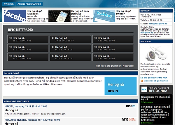Nettsiden til P1s nyhets- og aktualitetsmagasin Her og nå på nrk.no illustrerer poenget. Facebook og Twitter har fått logoene sine plassert i et felt på toppen av siden med lenker til redaksjonens Facebook-side og Twitter-konto. Og i høyre spalte har NRK plassert en feed med de siste Twitter-meldingene fra Her og nå.
