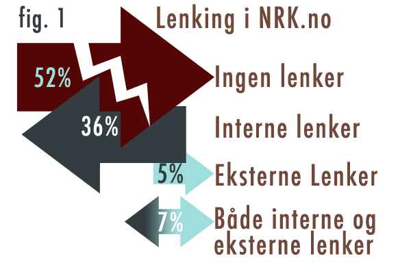 NRK benyttet heller ikke hyperlenker særlig mye i sin daglige nyhetsformidling. Som figur 1 viser hadde nesten halvparten av sakene minst én lenke i teksten, men kun 12 prosent hadde eksterne lenker. Bruken av lenker i nyhetsdekningen var altså i hovedsak forbindelser mellom NRKs eget materiale. Den ikke-kommersielle allmennkringkasteren koblet kun i begrenset grad sine nyhetssaker til andre aktører — og deres kilder, potensielt motstridende synspunkt, eller utdypende informasjon — gjennom bruk av eksterne lenker.