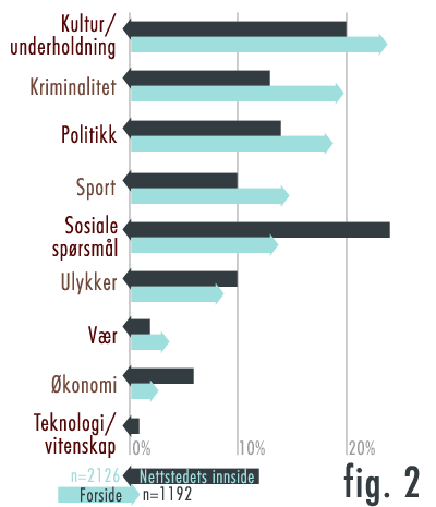 Figur 2 sammenligner forsiden og innsiden fordelt på overordnede innholdskategorier. Forsiden var preget av kultur- og underholdningssaker, etterfulgt av krim og politikk. Det er verdt å merke seg her at kultur- og underholdning inkluderer omtale av NRKs egne program. Det er også verdt å merke seg at selv om kultur og underholdning var størst i antall saker, så prioriterte NRK politikk og krim på topp: Disse kategoriene var oftest førstesaken — altså den saken som står øverst på forsiden — og også godt representert blant de påfølgende toppsakene. Kultur og underholdning, derimot, var lavere prioritert, og kom typisk som fjerdesak.