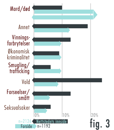 Hvis vi ser nærmere på hvilke typer krimsaker som ble dekket på henholdsvis forside og på nrk.no som helhet, så kommer forskjellene tydeligere fram (figur 3). På forsiden vektlegger NRK drap og mistenkelige dødsfall i overveldende grad. Disse sakene drukner imidlertid i helheten — altså i krimdekningen på nettstedet totalt sett — der vold, vinningsforbrytelser og småkriminalitet er store kategorier. Når noen dør uventet dekkes dette altså løpende med høy prioritet på forsiden av nrk.no, mens innsiden er preget av mindre voldsepisoder, hærverk, og fyllekjøring — altså dagligdagse hendelser fra lokalsamfunnet.