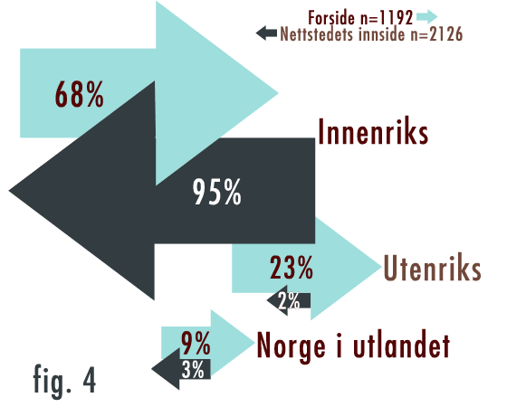 En annen måte å illustrere de to sidene ved NRKs nettsted er ved å se på internasjonale nyheter. Figur 4 viser hvordan de tekstbaserte artiklene på nrk.no som helhet bød kun på 2 prosent internasjonale nyheter i 2009. Til sammenligning var 23 prosent av sakene på forsiden utenriks. Igjen reflekteres tosidigheten: På forsiden løftes internasjonale tema fram — ofte knyttet til politiske ledere, konflikt og krig. På innsiden, derimot, minner NRKs nettsted om en samling lokale nyhetsformidlere: 95 prosent av artiklene handler om innenriksstoff.