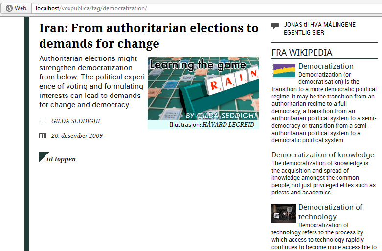 Siste skudd på dette treet er utvidelsen Wikipedia for tag pages. Som webansvarlig i Vox Publica jobber jeg mye med å utvide funksjonaliteten til nettmagasinet. Mye av denne funksjonaliteten er spesialkodet for VP, men noen ganger kommer man over ideer som er så generelle at flere kan få nytte av dem. Dette var tilfellet da jeg hadde lyst til å implementere utdrag av relevante wikipediaartikler på temasidene våre.
