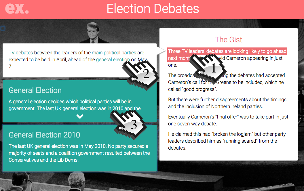 Her ser vi et eksempel på hvordan dette kan se ut på explaain.com. Til venstre under overskriften: “the gist” (sakens kjerne) er en tekstlig bekrivelse av hva som har skjedd. Den er kompakt og inneholder bare det viktigste. Nesten alle setningene er klikkbare for å vise mer informasjon. Evans bruker læringskort (flash cards) som metafor for alle atomiske fakta i systemet sitt. Når jeg klikker på den første setningen, får jeg opp informasjon for læringskortet om “tv-debatten”, ved å klikke videre på “general election” får jeg opp læringskortet for parlamentsvalget i 2010, som denne debatten foregikk i forkant av. Noen trenger ikke all denne informasjonen, mens andre gjør det. På denne måten kan informasjonsmengden justeres etter leserens behov.
