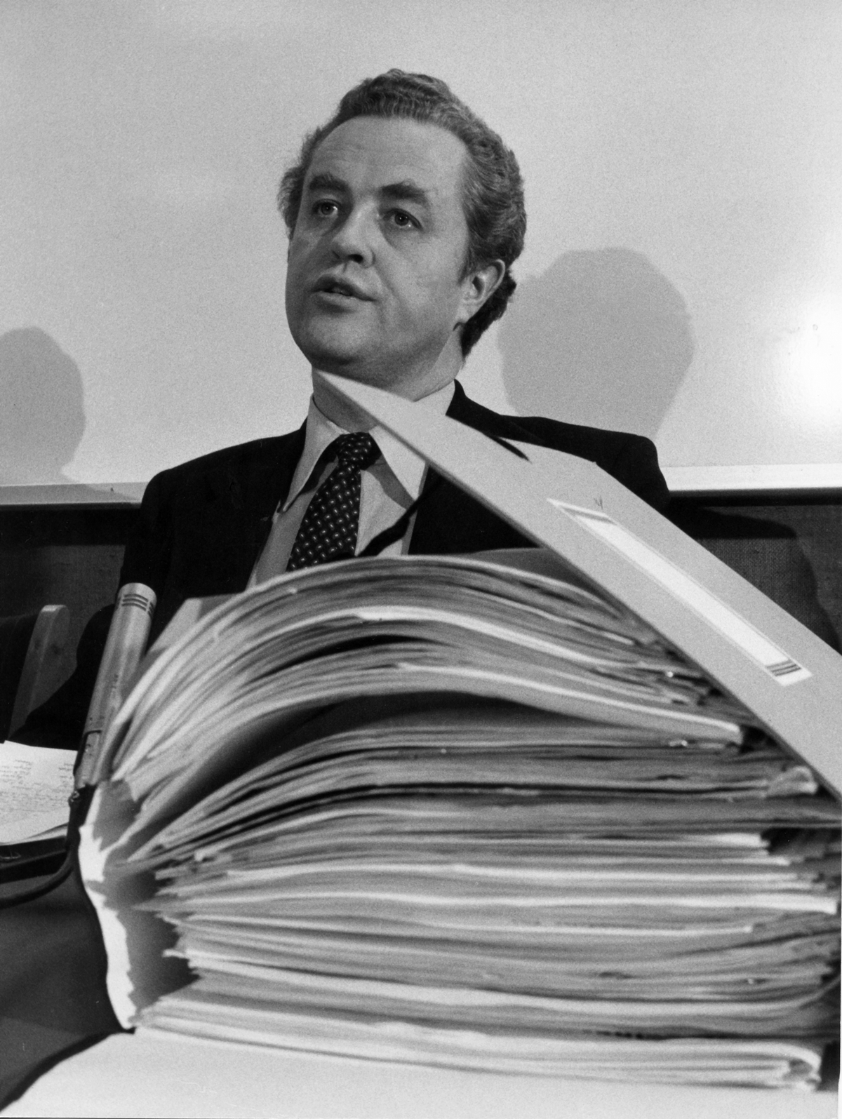 Oslo 16. desember 1981: Kulturminister Lars Roar Langslet offentliggjør hvem som skal få drive forsøksvirksomhet med nærradio. Dokumentbunken foran ham er alle søknadene om nærradiodrift. Foto: Bjørn Sigurdsøn / NTB scanpix