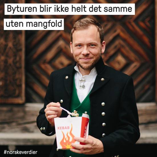 Foto Sandberg: Helge Mikalsen, VG I valgkampen 2013 dukket plutselig SV-ledelsen opp på sosiale medier ikledd bunad sammen med teksten «La oss snakke om norske verdier». Kampanjen bestod av flere bilder, deriblant et som viste en bunadskledd Audun Lysbakken foran en gammel seter med en kebab i handa. Øverst i bildet står teksten: «Byturen blir ikke helt den samme uten mangfold», i sterk kontrast til de landlige omgivelsene og partilederens påkledning.